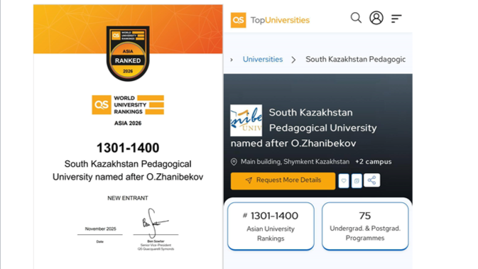ZHANIBEKOV UNIVERSITY әлемдік QS Asia University Rankings-2026 нәтижесі бойынша Азия университеттері арасында 1301–1400 орын және Орталық Азия бойынша ТОП-100 қатарына еніп, 71-орынды иеленді!