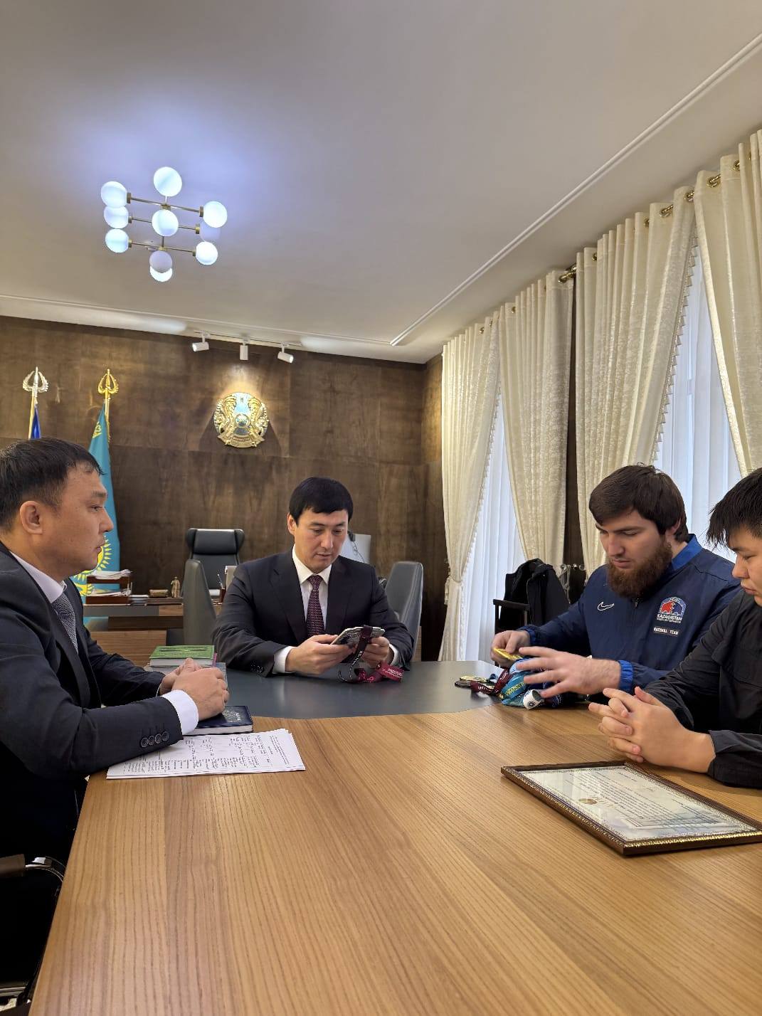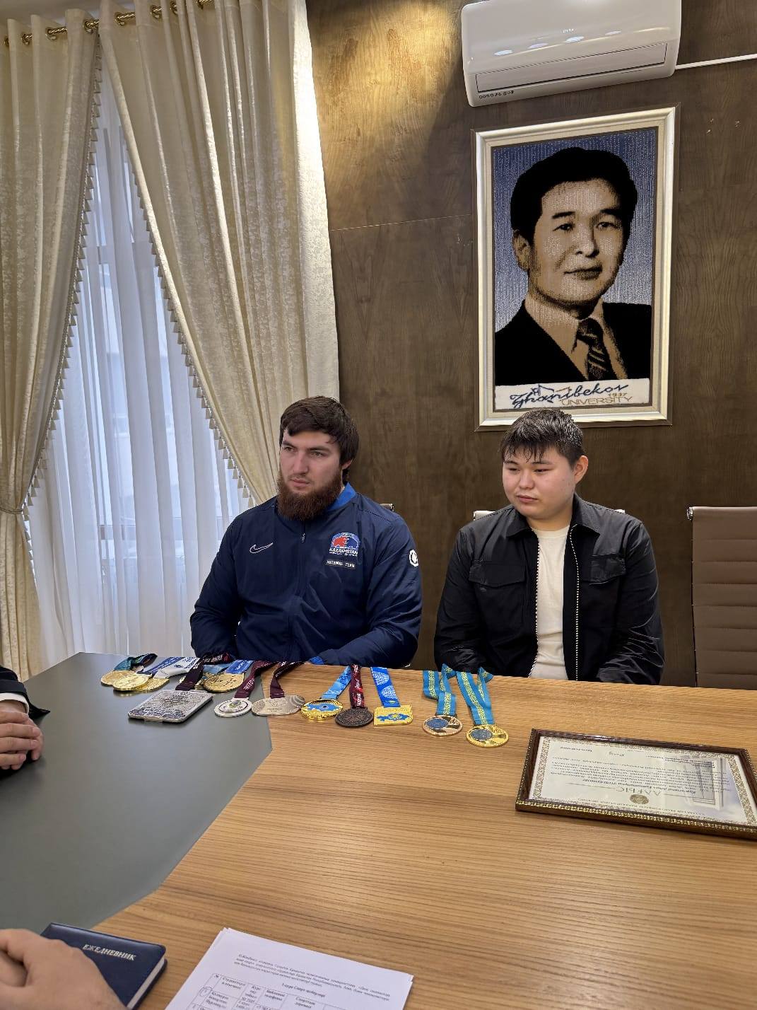 Өзбекәлі Жәнібеков атындағы ОҚПУ Басқарма төрағасы-ректордың міндетін атқарушы Әлібек Нұртаев әлемдік додаларда ел намысын қолдан бермей жүрген қос спортшыны қабылдады.