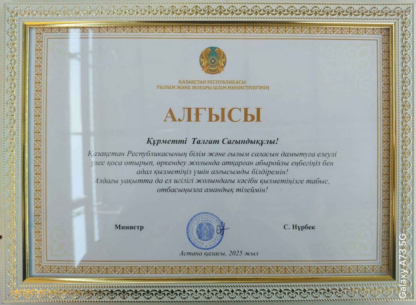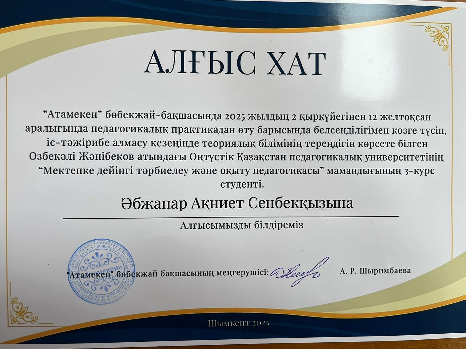 Letter of gratitude Kuzhagulova G.