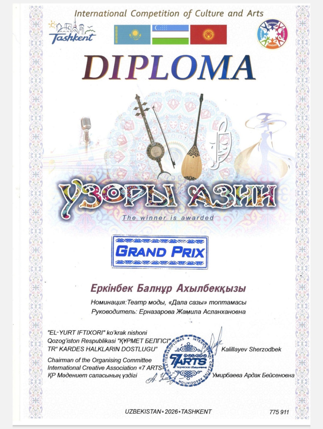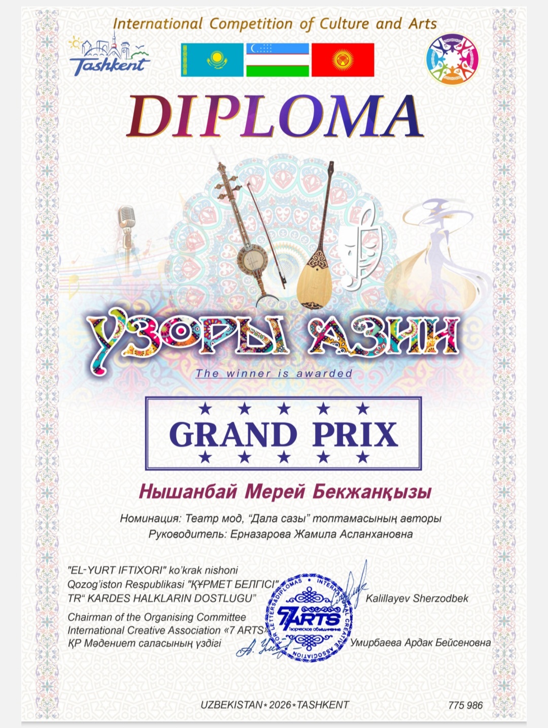 Өзбекстан Республикасы Ташкент қаласында «Узоры Азии» аты мәдениет және өнер халқаралық фестиваль-байқауы Бас жүлде.